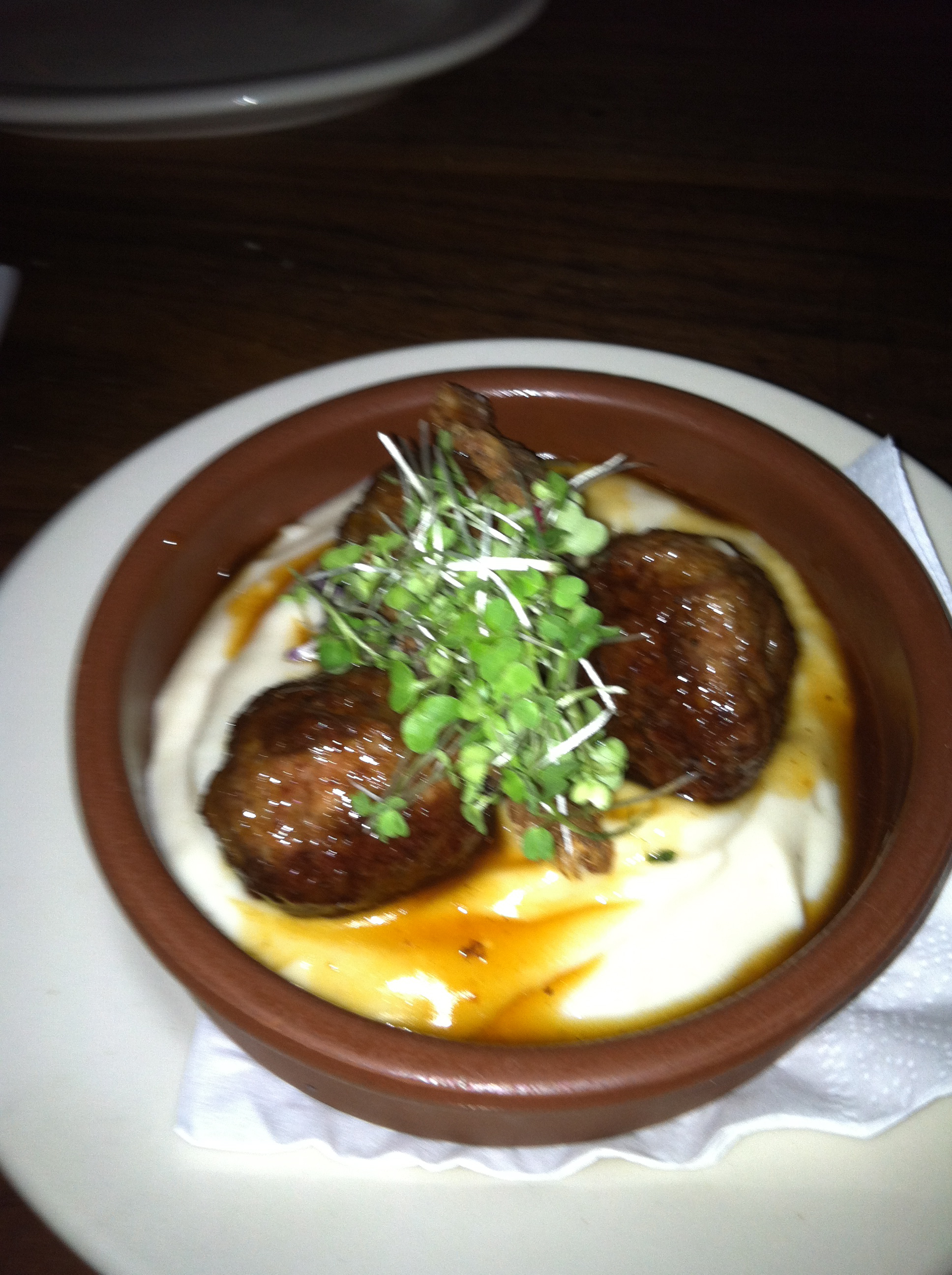 We ordered 6 tapas.. crispy brussel sprouts with siracha sauce, garlicky broccoli rabe, butternut squash with pepitas and manchego cheese, steak with truffle sauce, albondigas (beef/pork meatballs) and duck meatballs.